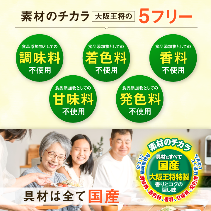 大阪王将公式通販本店は、2023年3月8日にサイトの全面リニューアルをいたしました。 スマートフォンやタブレット端末からもご利用いただきやすいレスポンシブデザインを採用しております。 今後ともご愛顧賜りますようお願い申し上げます。